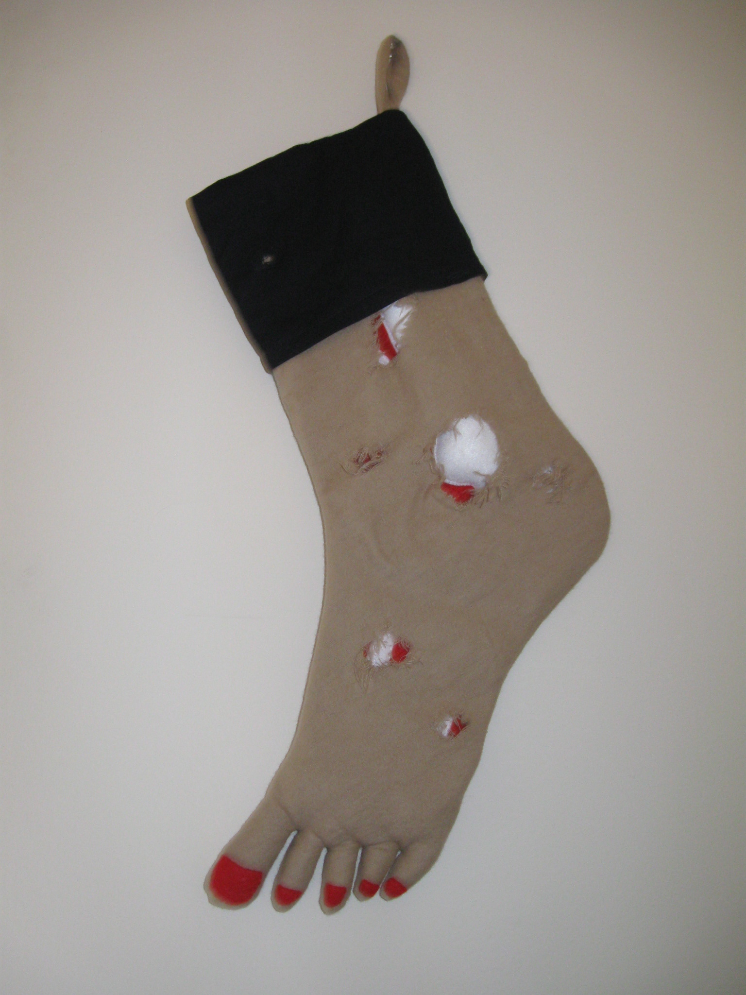 For the love of zombies! This undead sox is of a "fresher" complexion. Zombie sox is complete with decorated toenails, and bone protruding wound. Have a Creepy Christmas!