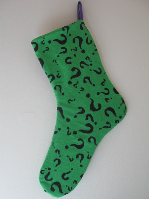 Like questions? Like answers? Like green? Just like question marks? This Sox is for you! Hand printed design with purple stripe on one side and solid question mark pattern on the reverse, hang either way.